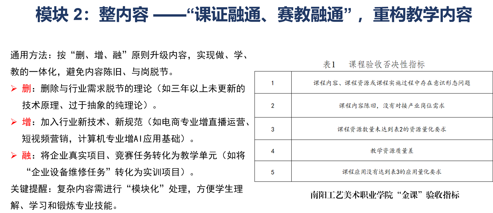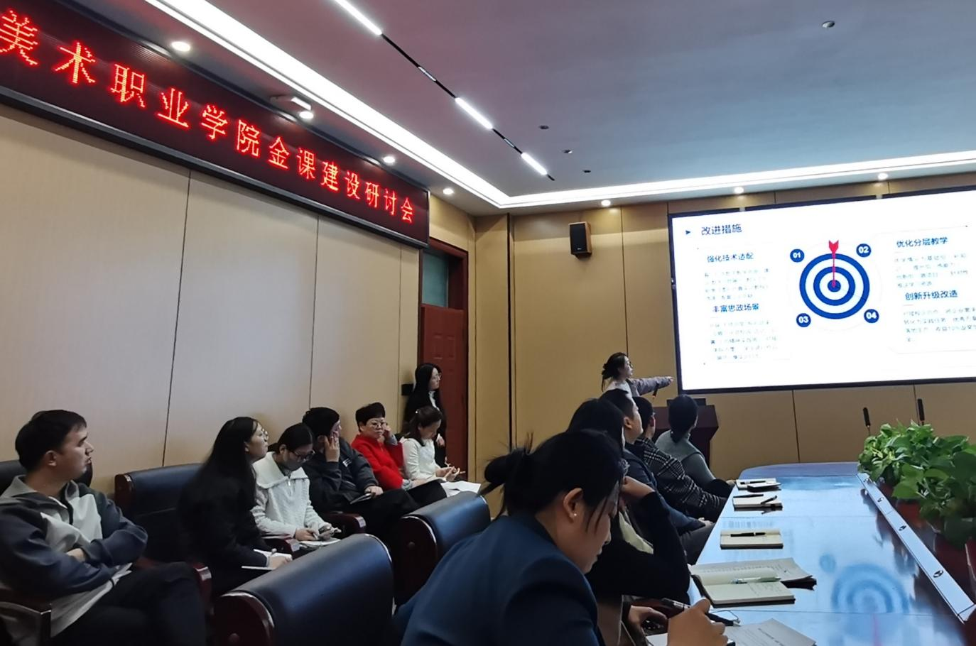 随后,“金课”建设路径成为研讨焦点。与会人员围绕“定标准、整内容、建资源、抓实施、强团队”五大模块展开讨论。在课程标准制定上,需联合企业技术骨干与行业协会专家,拆解岗位典型工作任务,融入职业技能标准、1+X证书考点及技能大赛标准,同时厘清与前后序课程的衔接关系。教学内容按照“删、增、融”原则进行升级——删除脱离行业需求的陈旧理论,依照各专业人才培养标准增加直播运营、AI应用基础等行业新技术,将企业真实项目与竞赛任务转化为教学单元,复杂内容需进行模块化拆分,适配学生自主学习需求。资源建设需严格遵循《南阳工艺美术职业学院“金课”验收指标》,明确课程宣传片、微视频、习题库等量化要求,划定课程内容陈旧、教学资源质量差等否决“红线”。教学实施推行“线上学习通闭环+线下实训/情景模拟”混合式教学,推动“做、学、教”一体化。教师团队聚焦“双师结构”,要求校内教师定期赴企业实践、提升数字技能,引入行业专家担任兼职教师,明确团队分工,避免“一人包揽”现象