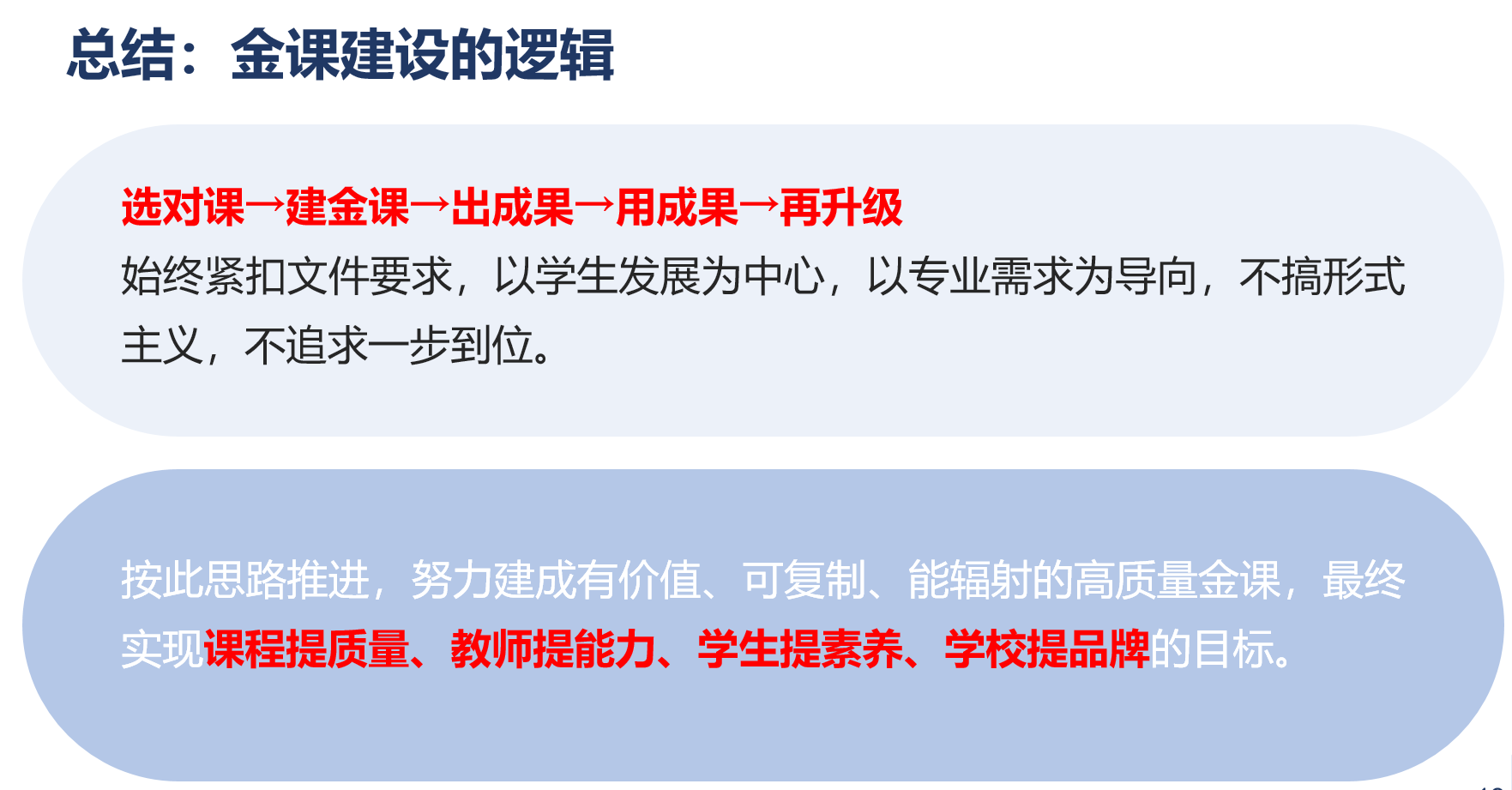 徐盈部长在总结中指出,“金课”建设是学校提升教学质量的核心抓手,需始终紧扣“以学生发展为中心、以专业需求为导向”原则,避免形式主义。各部门要协同推进,力争建成有价值、可复制、能辐射的高质量“金课”,最终实现课程提质量、教师提能力、学生提素养、学校提品牌的目标。