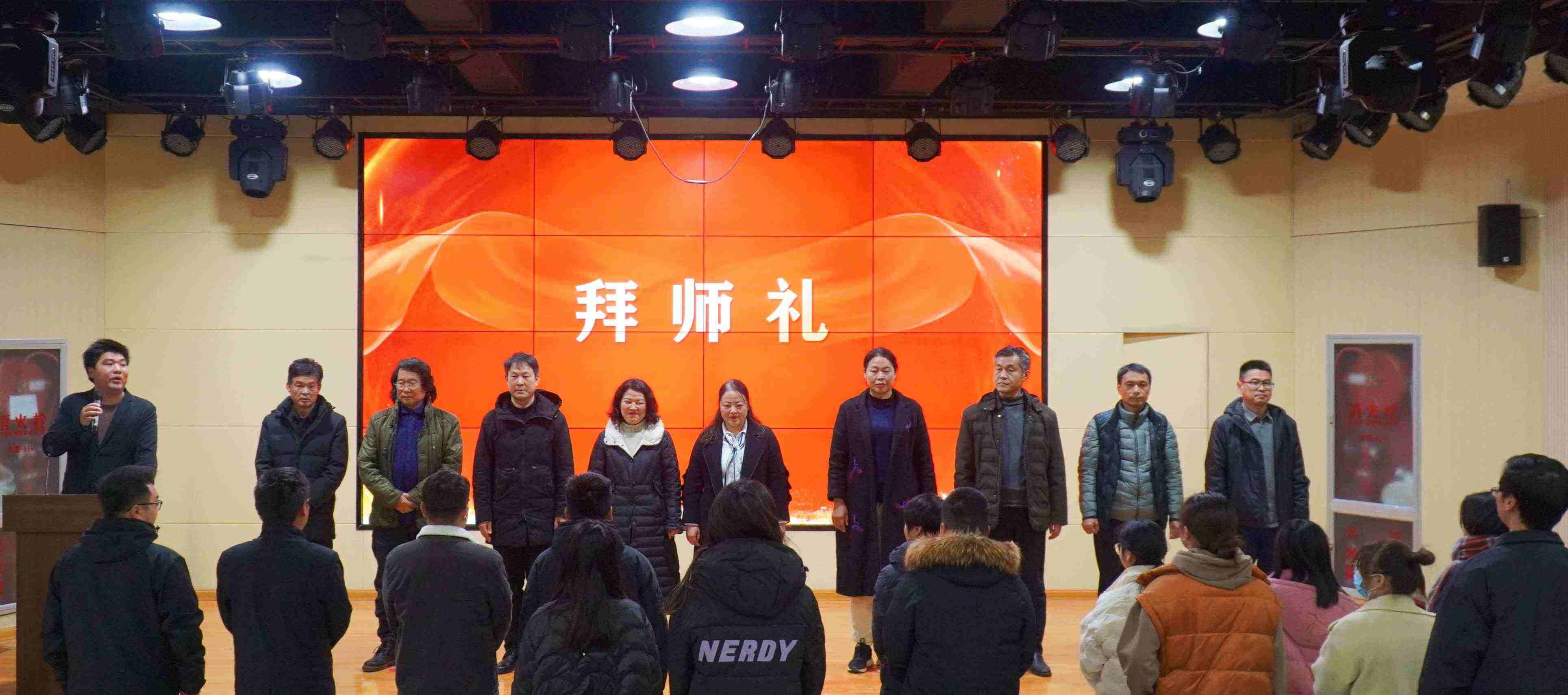 仪式伊始,高鹏、梁浩等领导成员分别为青蓝工程的指导教师颁发聘书,并合影留念。随后,全体青年教师向指导老师鞠躬表示敬意。