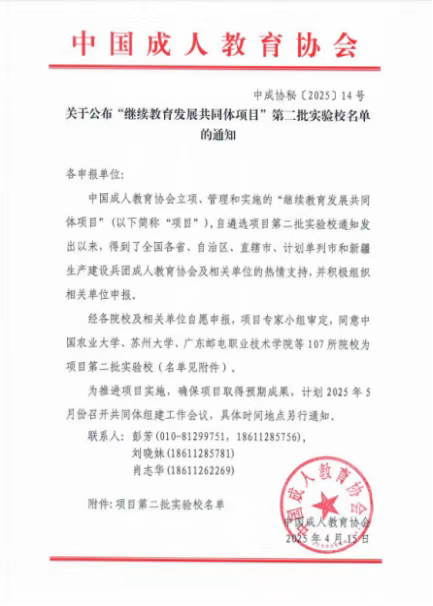4月,学校成功入选中国成人教育协会“继续教育发展共同体”第二批实验校。以此为战略支点,学校将深度融入国家教育现代化布局,创新构建“职教—高教—继教”深度融合、协同发展的终身学习生态系统。这一重要进展不仅彰显了学校在服务全民终身学习、培育发展新动能中的使命担当,更标志着南阳美院正成为区域现代职教体系建设的创新高地和实践标杆,为新时代学习型社会建设贡献职教力量。