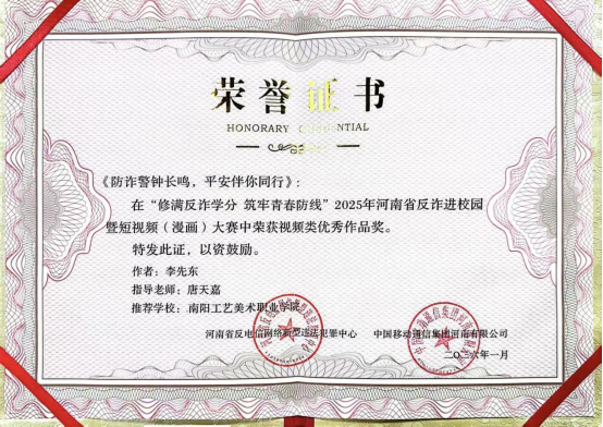 由河南省公安厅、河南省教育厅、共青团河南省委和河南广播电视台指导,河南省反电信网络新型违法犯罪中心、中国移动通信集团河南有限公司联合主办,河南广播电视台法治频道承办的“修满反诈学分,筑牢青春防线”2025年河南省反诈进校园暨短视频(漫画)大赛圆满结束。