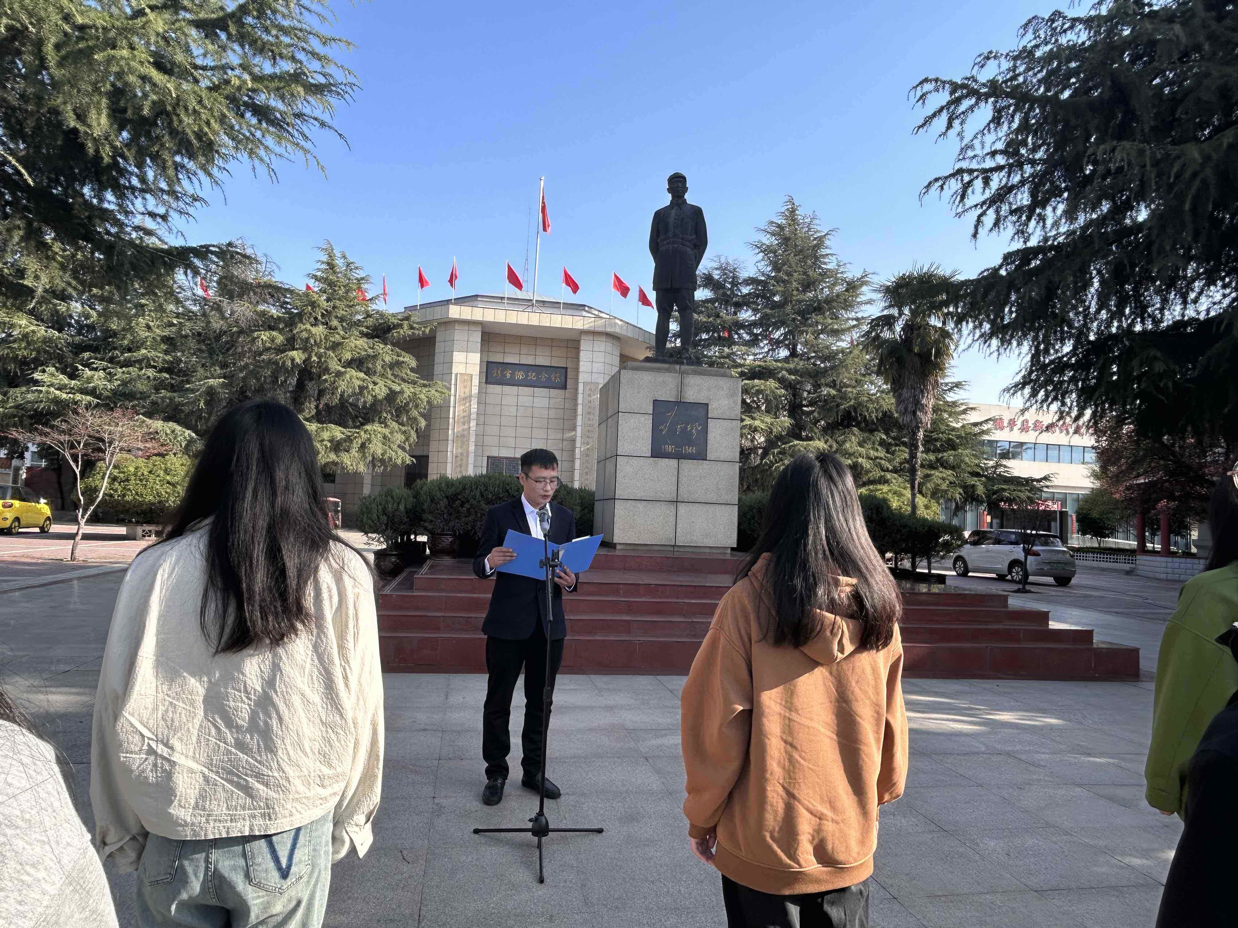 校团委王果老师为大家介绍彭雪枫烈士的英勇事迹,并号召全体同学永远铭记先烈们的宏伟业绩,大力弘扬雪枫精神,努力学习,不辜负老师和先辈的期望。
