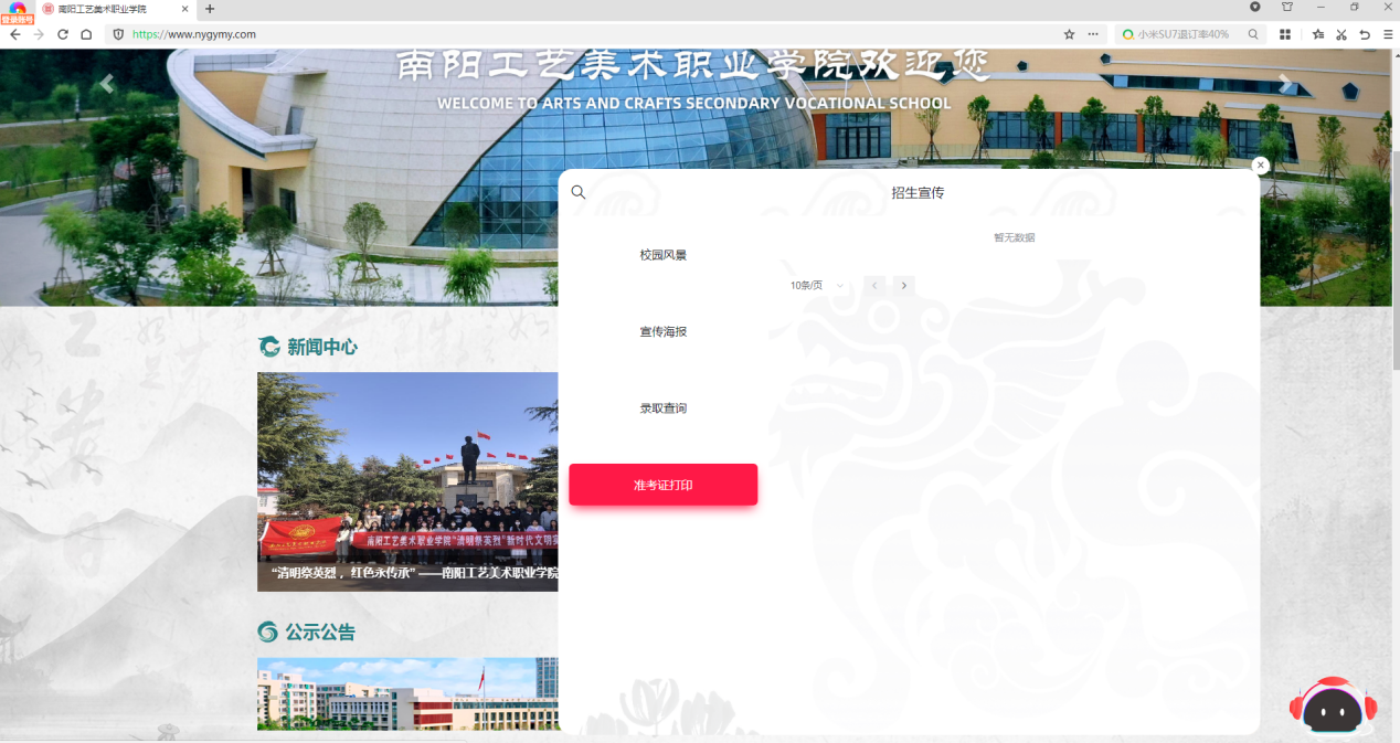 1.在浏览器输入或粘贴网址:https://www.nygymy.com,进入“南阳工艺美术职业学院”官网,点击右下角“机器人”图标,弹出窗口中的“准考证打印”,按照顺序输入身份证号、姓名、考生号、验证码后点击登录。