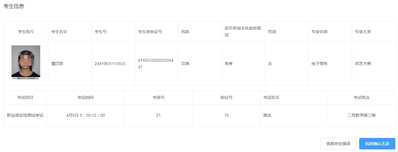 2.确认准考证信息:进入信息核对页面,请核对个人信息,确认无误后,点击“信息确认无误”,跳转至准考证打印界面,然后下载打印准考证(A4纸彩色打印)。