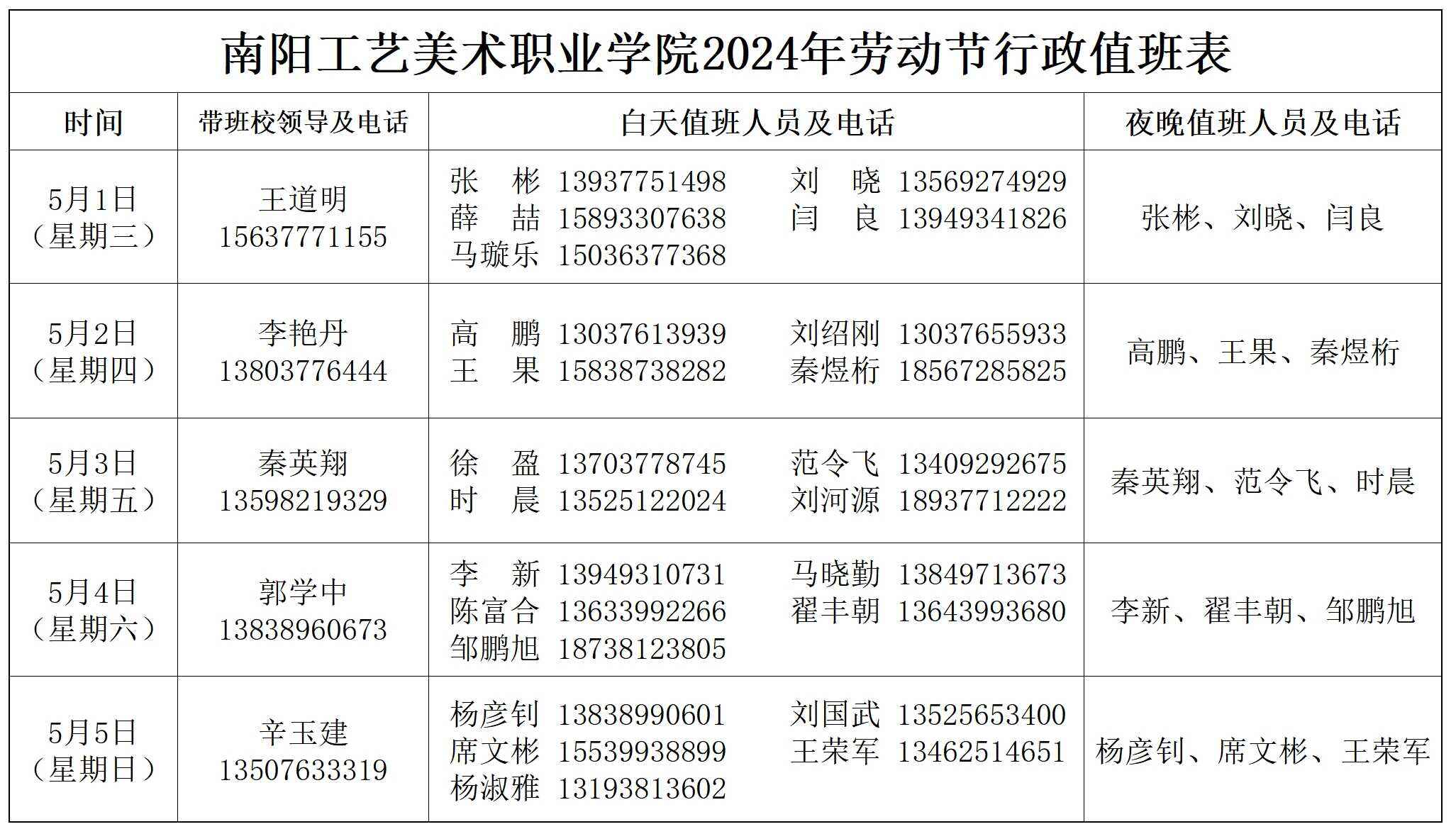 5、学校值班情况详见《南阳工艺美术职业学院2024年劳动节行政值班表》(附件1)。