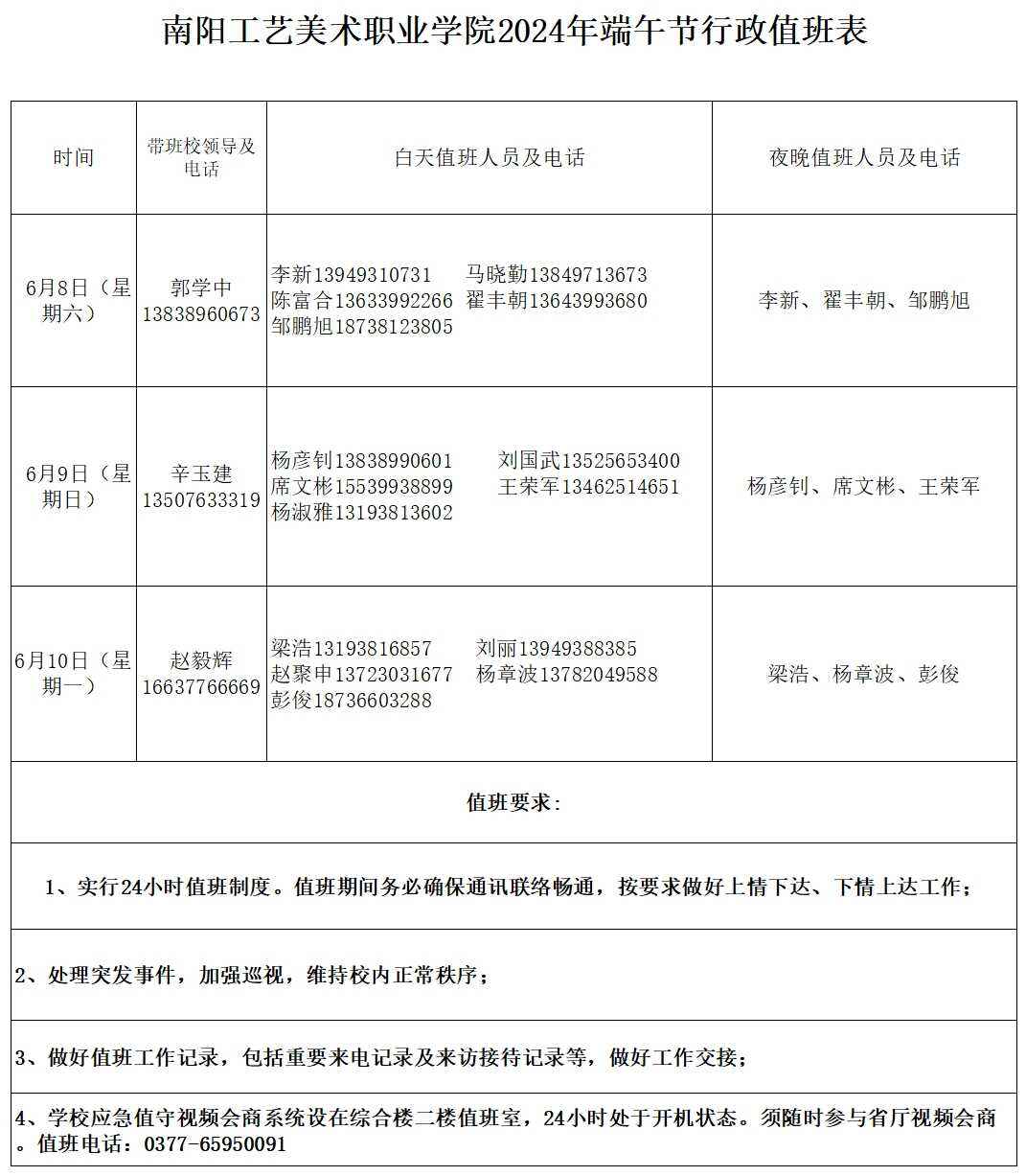 5、学校值班情况详见《南阳工艺美术职业学院2024年端午节行政值班表》(附件1)。