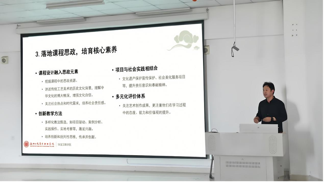 珠宝玉雕学院行政负责人陈安定分享了《聚焦核心素养 落地课程思政——珠宝玉雕课程思政路径探究》,提出强化思想政治教育、聚焦专业特质及实施课程设计等四大措施,强调了“琢玉先做人,做人立玉德”的育人理念。
