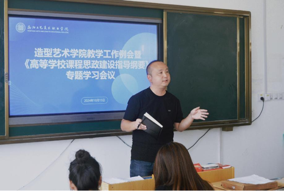产品设计学院负责人邹鹏旭带领全体教师学习了纲要的具体内容,并鼓励教师们创新课程思政教学方法。造型艺术学院负责人高鹏在会上详细解读了纲要文件内容,并表示将以此次学习为契机,进一步提升自身的思政教育能力。