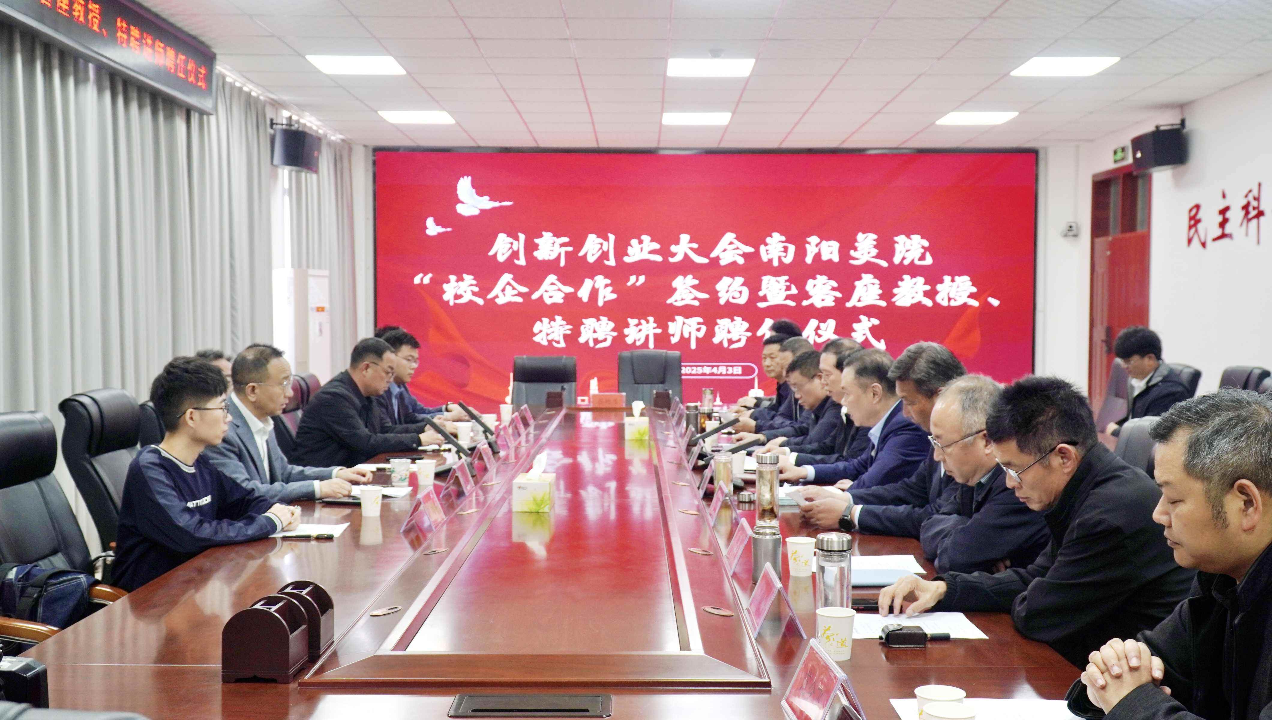 4月3日,创新创业大会南阳美院校企合作签约暨客座教授、特聘讲师聘任仪式在我校隆重举行。镇平县政协主席胡著伟出席会议,校党委书记赵毅辉,校长胡楠等校领导班子成员,北京经济管理职业学院副院长魏中龙、珠宝与艺术设计学院院长张晓晖,河南新工匠智能系统有限公司总经理刘笑、深圳市彩宝城珠宝产业链有限公司设计总监雷加木、玉石智谷产业园副总经理陈义沣等行业专家及企业代表共聚一堂,见证校企合作新起点。