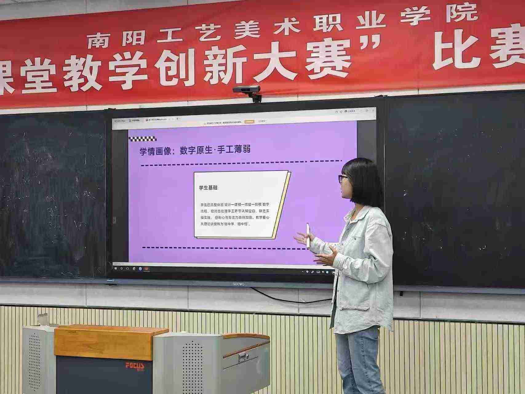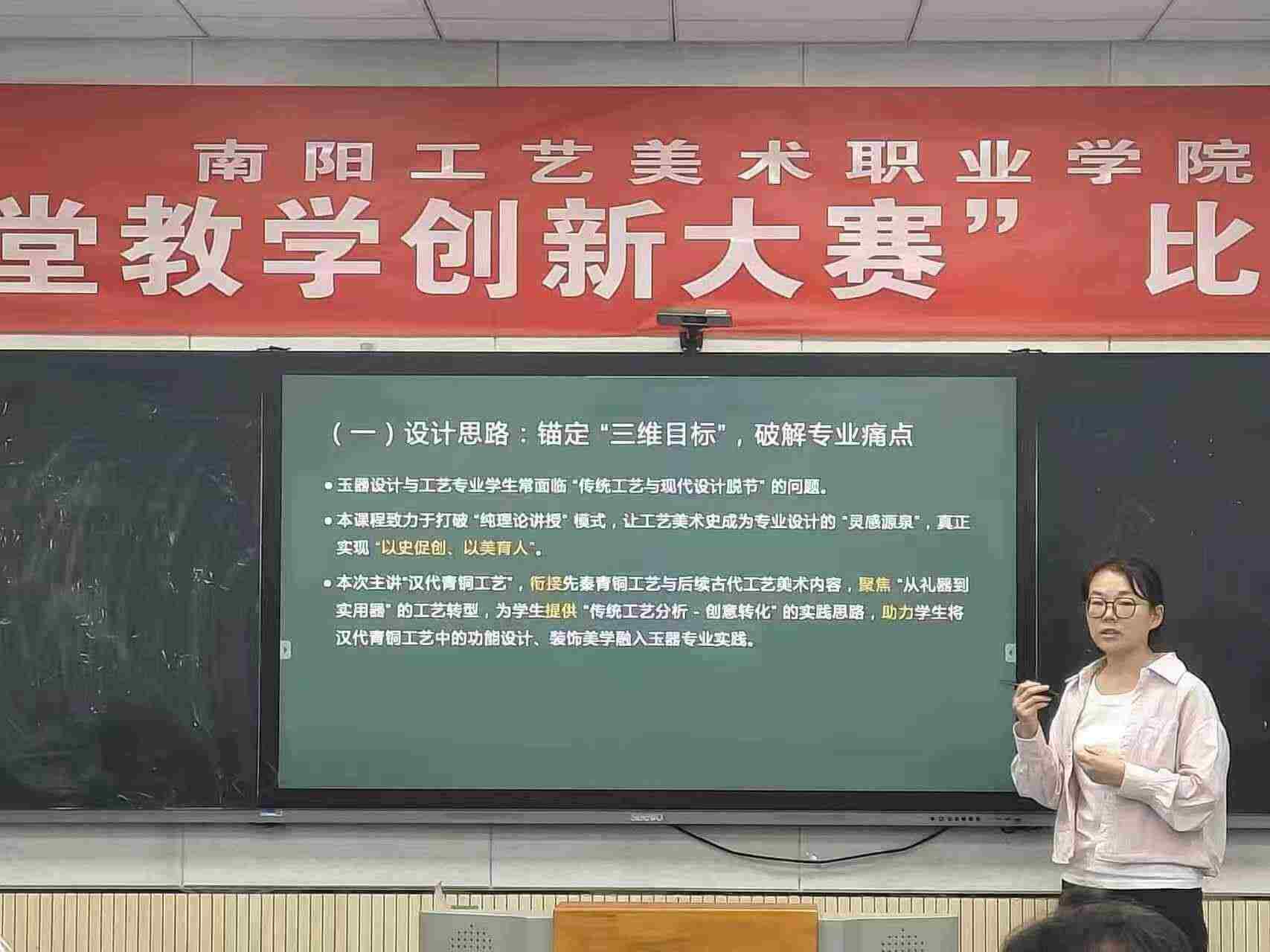 为深入贯彻落实国家职业教育改革精神,推动课堂教学“创新革命”,9月18日上午,南阳工艺美术职业学院举办课堂教学创新大赛决赛。教务科研部部长徐盈、珠宝玉雕学院院长陈安定、造型艺术学院院长王超麟、现代技术学院院长范令飞、教务科研部副部长孟卓以及教学督导杨红尧老师担任评委,对比赛的教学设计、课堂呈现及创新融入进行指导。来自各学院的优秀教师同台竞技,全方位展示了我院在课程重构、教学模式、教学方法与评价机制上的创新探索与实践成果。大赛旨在以赛促教、以赛促学、以赛促改、以赛促创,全面提升技术技能人才培养质量。