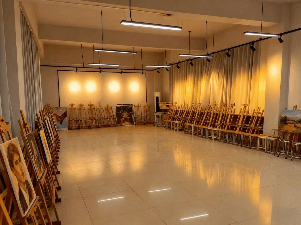 实训室配备优质核心设备与特色教学资源:每间画室均设有高清多媒体教学屏幕,可实时展示经典画作、技法演示视频,实现理论讲解与实操示范同步;合计配备100余套专业画板(单间50余个),满足学生分组实训需求;同时储备丰富教学模型,涵盖大卫、维纳斯等经典石膏像、各类几何石膏体及青花瓶、陶罐等瓷器模型,为不同课程的写生训练提供多样化素材。