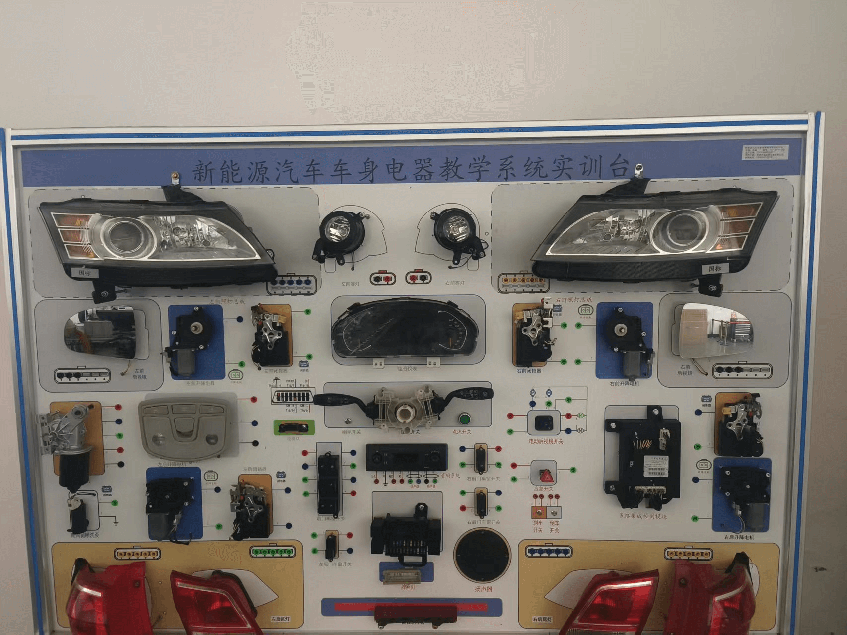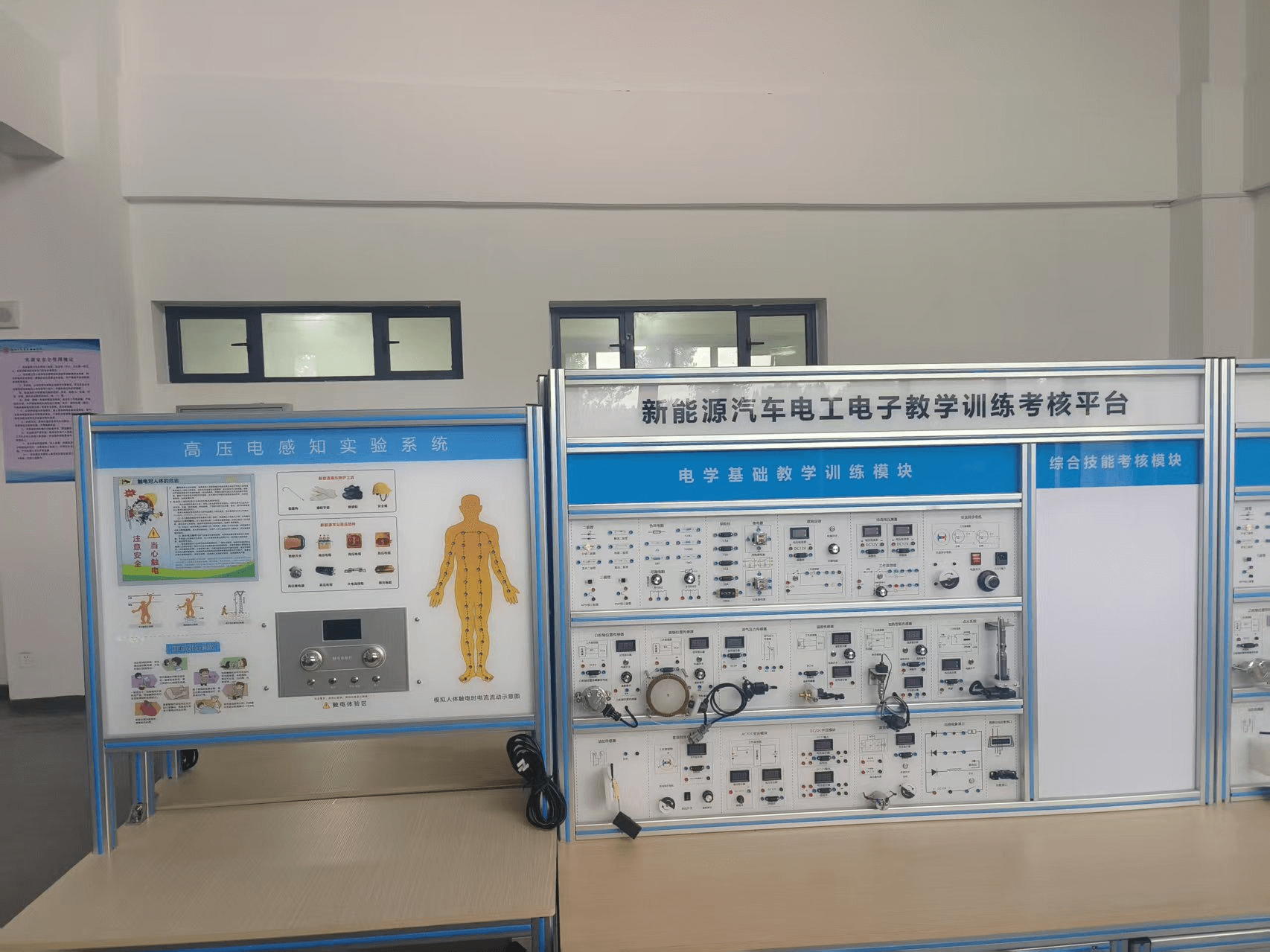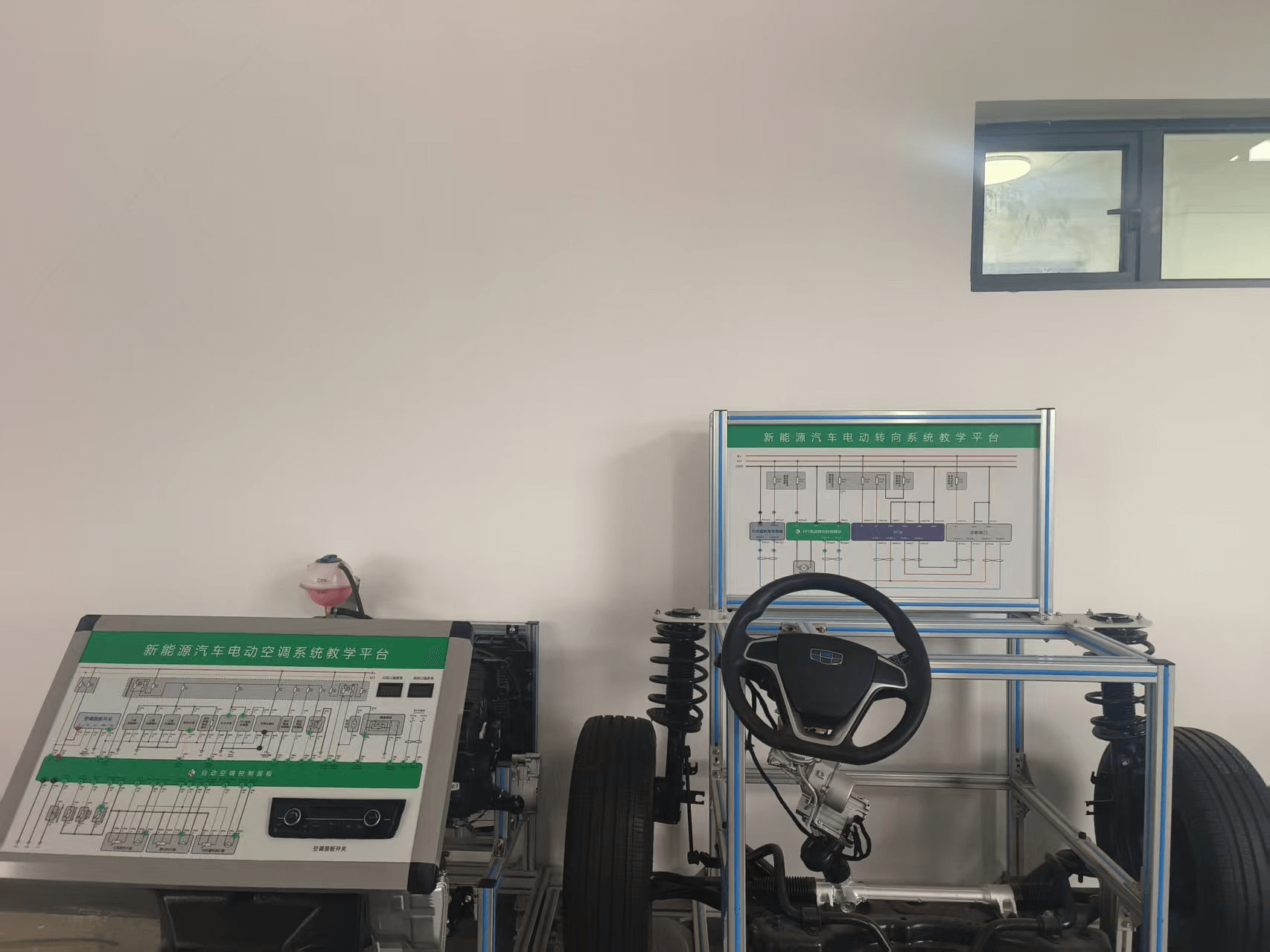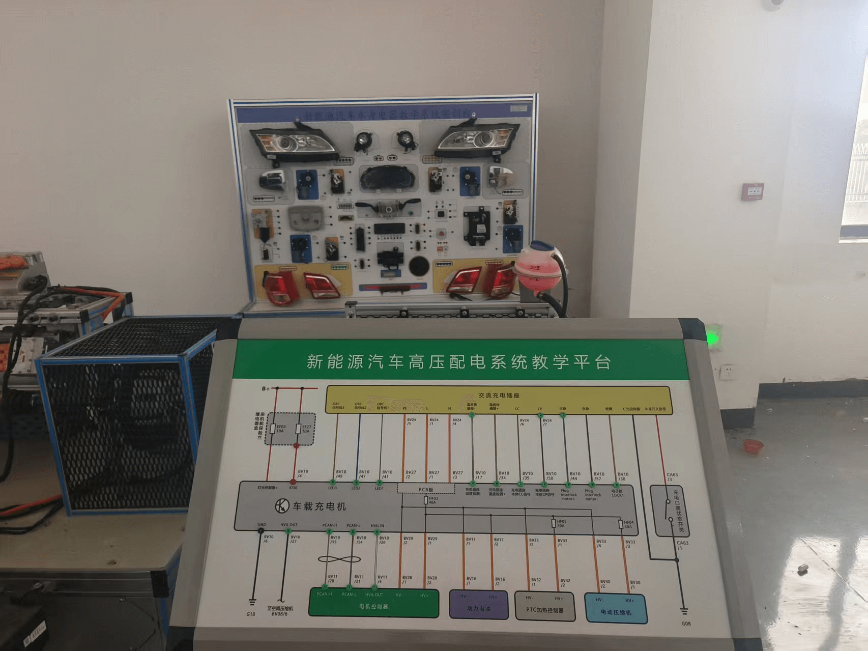 该实训室拥有新能源汽车电工电子教学训练考核平台、高压电感知实验系统、新能源汽车动力电池及电池管理系统教学平台、新能源汽车驱动电机及电机控制系统教学平台、新能源汽车高压配电系统教学平台、新能源汽车电动空调系统教学平台、新能源汽车电动转向系统教学平台、新能源教学实训整车、《新能源汽车整车典型故障诊断与排除》教学系统等设备。