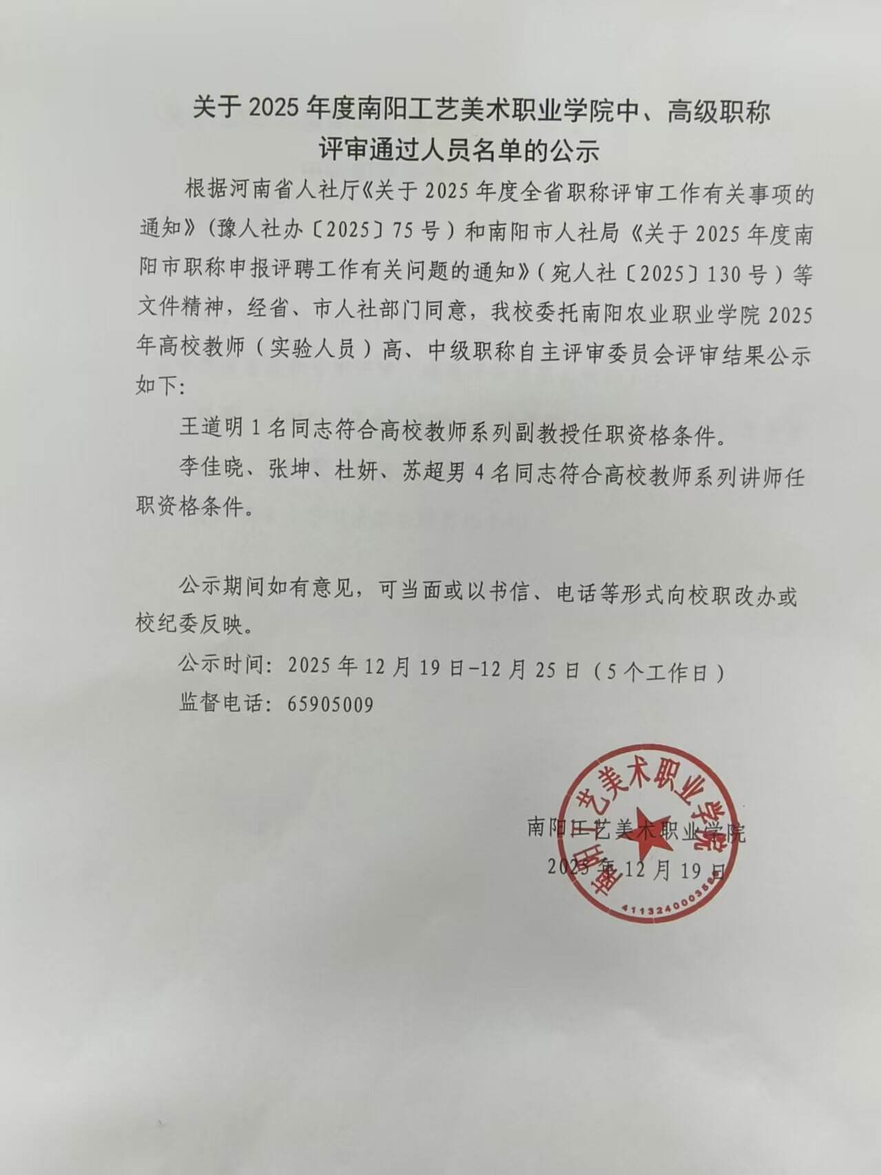 根据河南省人社厅《关于2025年度全省职称评审工作有关事项的通知》(豫人社办〔2025〕75号)和南阳市人社局《关于2025年度南阳市职称申报评聘工作有关问题的通知》(宛人社〔2025〕130号)等文件精神,经省、市人社部门同意,我校委托南阳农业职业学院2025年高校教师(实验人员)高、中级职称自主评审委员会评审结果公示如下: