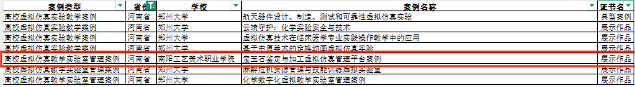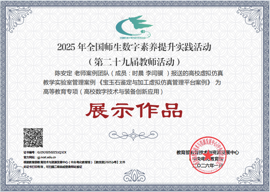 近日,2025年全国师生数字素养提升实践活动(第二十九届教师活动)“高等学校虚拟仿真教学创新实验室”项目案例征集结果揭晓。我院申报的宝玉石鉴定与加工虚拟仿真实训管理平台案例,在全国419件高等教育专项案例中脱颖而出,荣获高等教育专项(高校数字技术与装备创新应用)“展示作品”荣誉称号,成为“高校虚拟仿真教学实验室管理案例”河南省仅有的三个入选案例团队之一,同时也是我省在本次整个高校虚拟仿真实验案例活动中除郑州大学外唯一入选的高校,彰显了我校在虚拟仿真教学创新领域的扎实实力。
