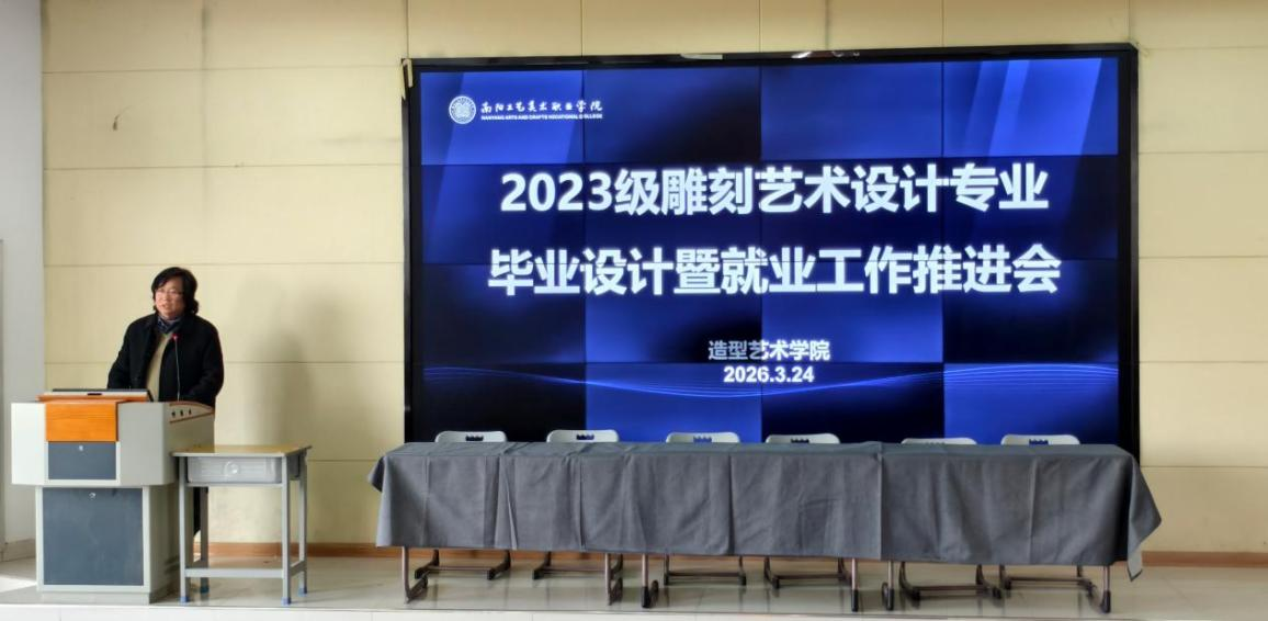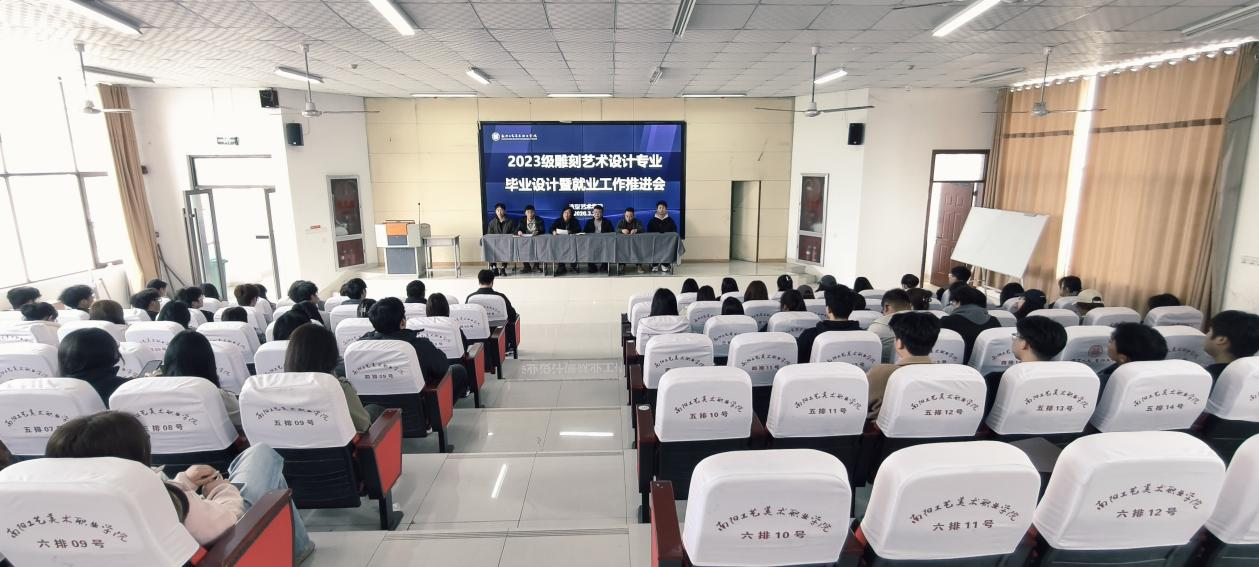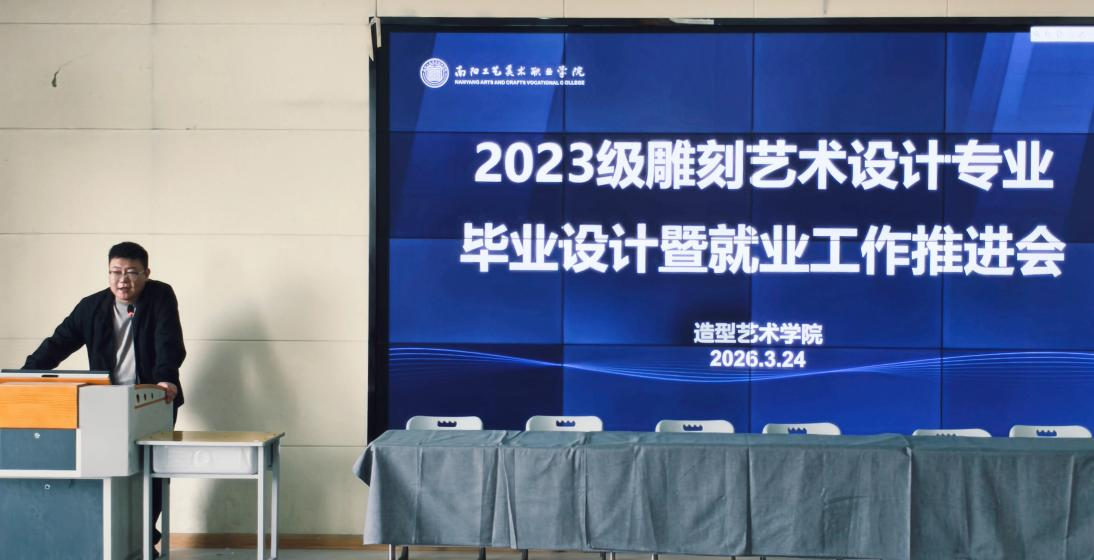 这个春意盎然的时节,造型艺术学院2023级雕刻艺术设计专业的同学们迎来了学业生涯的关键时刻。为统筹推进毕业创作与就业工作,2026年3月24日下午,学院在2309阶梯教室隆重召开了“匠心筑梦·砥砺前行”毕业设计暨就业推进会。出席会议的有造型艺术学院院长王超麟、副书记秦煜桁、副院长马腾飞、雕刻艺术设计教研室主任张坤,以及学院全体教职工、2023级雕刻艺术设计专业返校同学参加会议。会议特别邀请了河南省技术能手、玉雕大师秦俊涛老师,以及河南省玉雕大师张鹏老师莅临现场。会议由王院长主持。