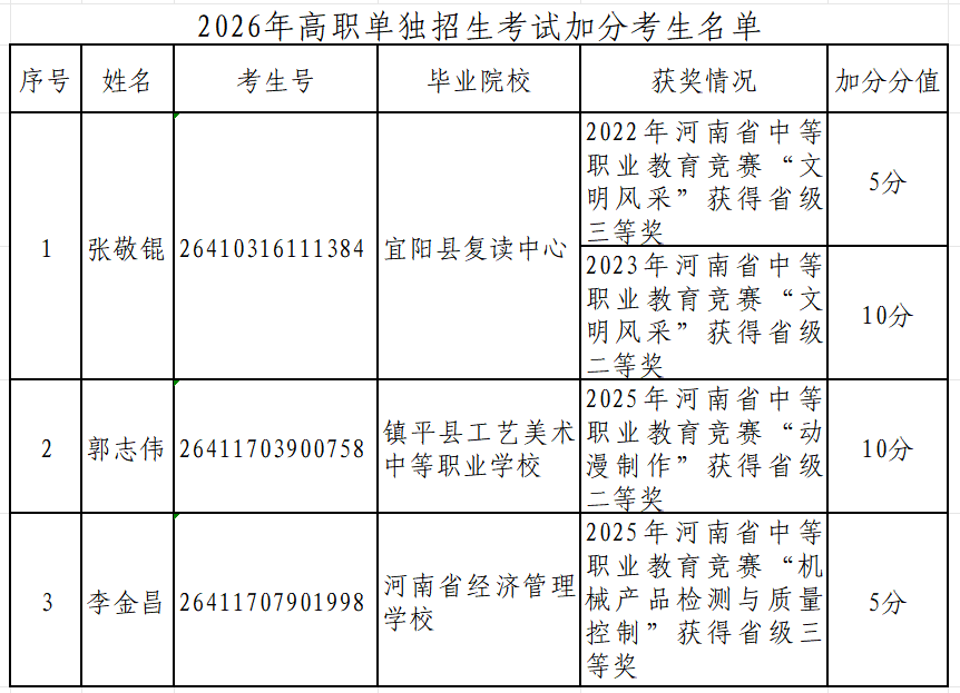 根据教育部及省教育厅招生相关政策规定,结合《南阳工艺美术职业学院2026年单独招生章程》要求,3名考生在规定时间内将相关证书材料送达我处,经审查符合加分条件。为确保招生工作公平、公正、公开,现将考生名单及奖项予以公示,公示期为3个工作日(4月27日-4月29日)。