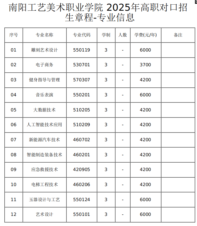 第十二条 招生专业:艺术设计、玉器设计与工艺、雕刻艺术设计、音乐表演、电子商务、新能源汽车技术、人工智能技术应用、大数据技术、智能制造装备技术、电梯工程技术、健身指导与管理、应急救援技术。