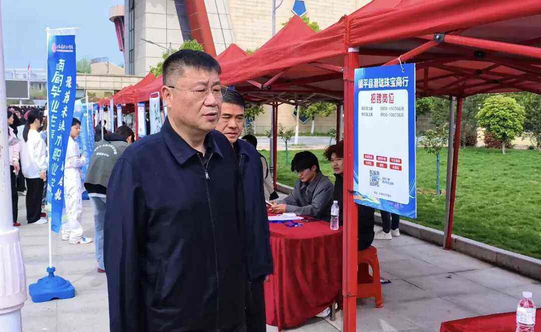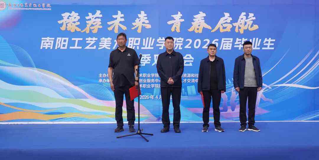 玉都聚英才,春风赴新程。4月15日,“豫荐未来 青春启航——南阳工艺美术职业学院2026届毕业生春季双选会”在我校大门口隆重举行。本次活动由镇平县人力资源和社会保障局与我校联合主办,旨在为毕业生与优质企业搭建精准高效、双向选择的就业对接平台。校长胡楠,校党委副书记郭学中,镇平县人力资源和社会保障局党组成员、就业创业服务中心主任庞从伟,镇平县人才交流中心主任孙鹏展等出席开幕式。开幕式由党委委员、副校长王道明主持。
